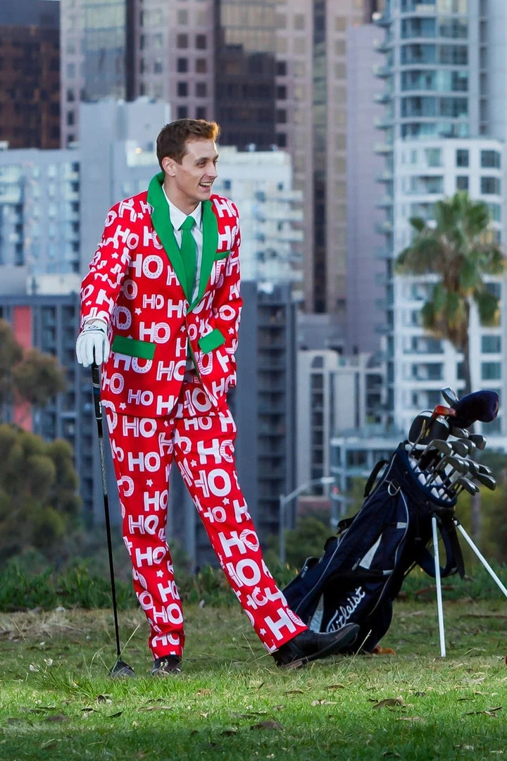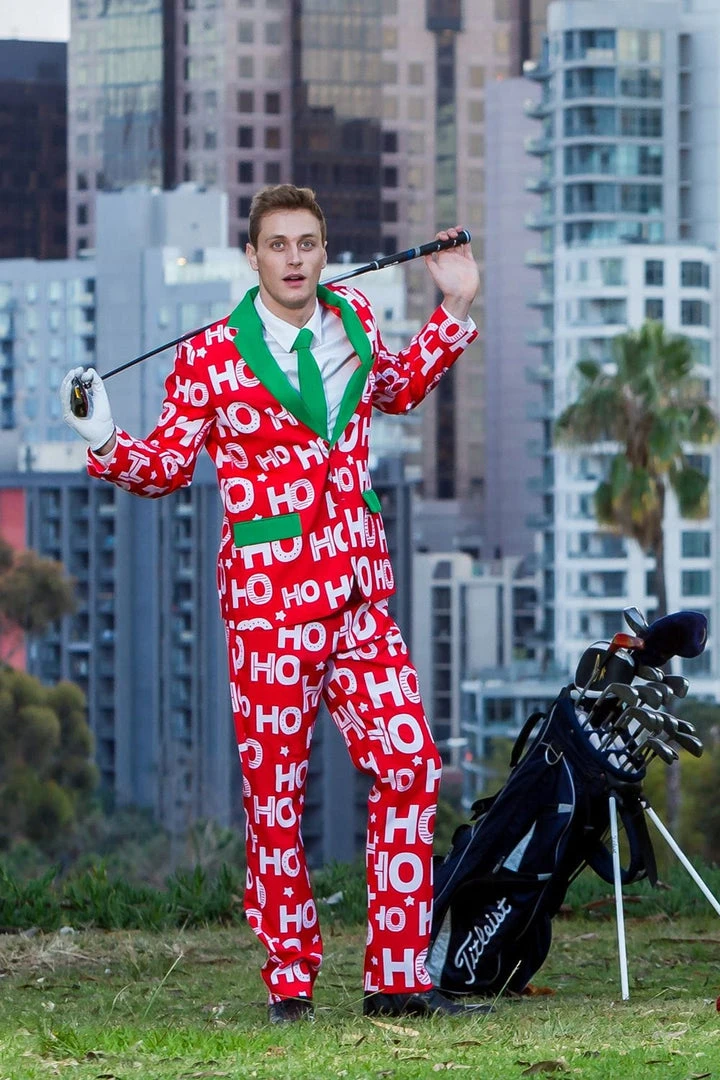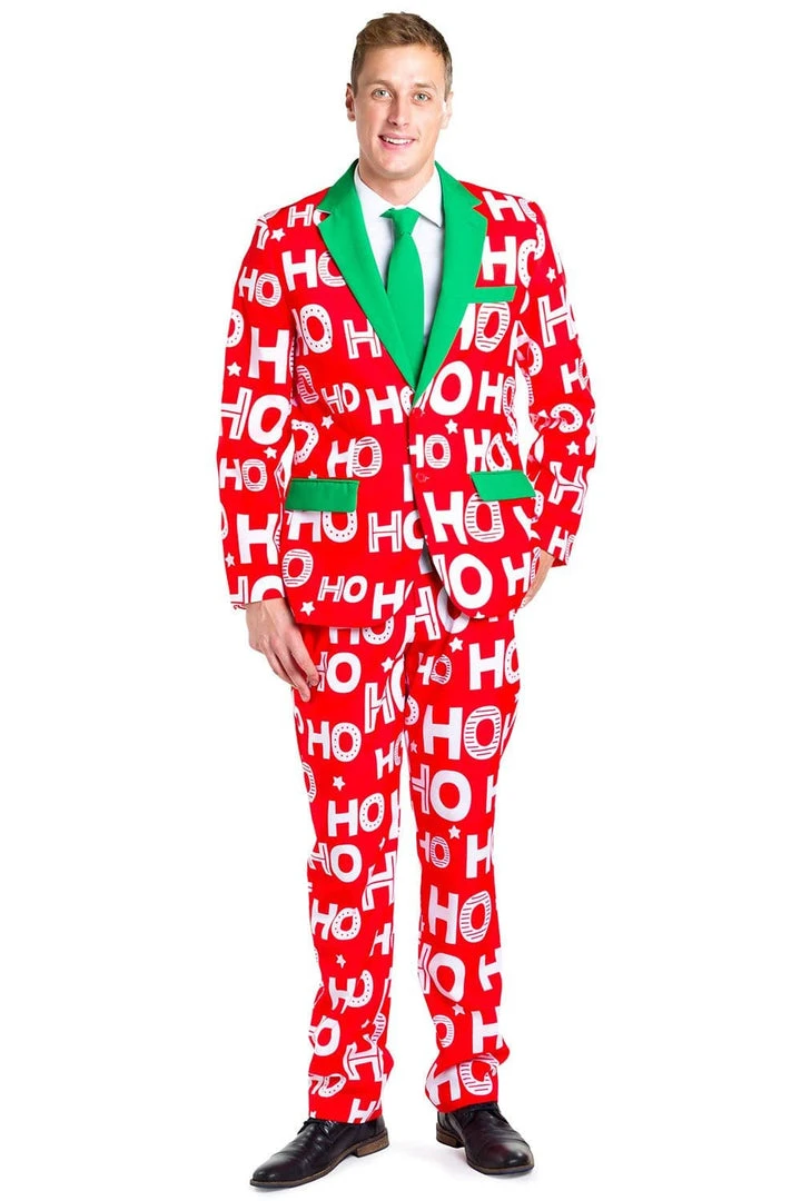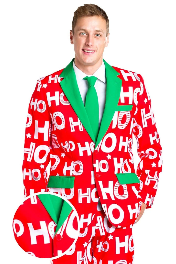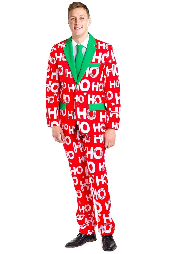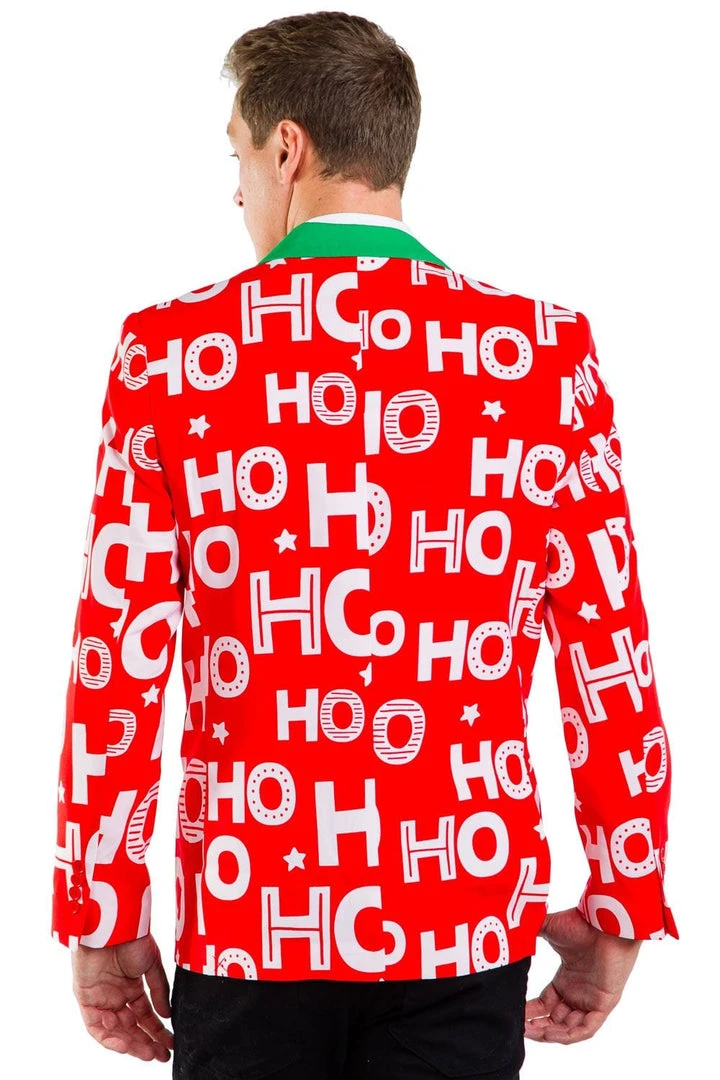 Rocking up to the office in a Santa suit might be frowned upon in corporate America, so if you feel like channeling your inner Saint Nick without breaking the rules, try this slogan-based blazer instead. This Men’s Red Ho Ho Ho Christmas Suit will have your colleagues shouting out Santa’s favorite phrase while you strut around with an air of festive seniority. With a Santa-esque red design, topped off by green trims and an equally fetching green tie, you’ll court the attention of only the most important people in the office – without having to deliver any presents. White beards are not in line with company policy, so rock this Ho Ho Holla Blazer instead!