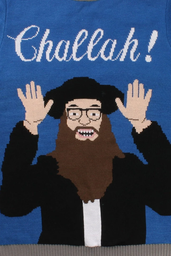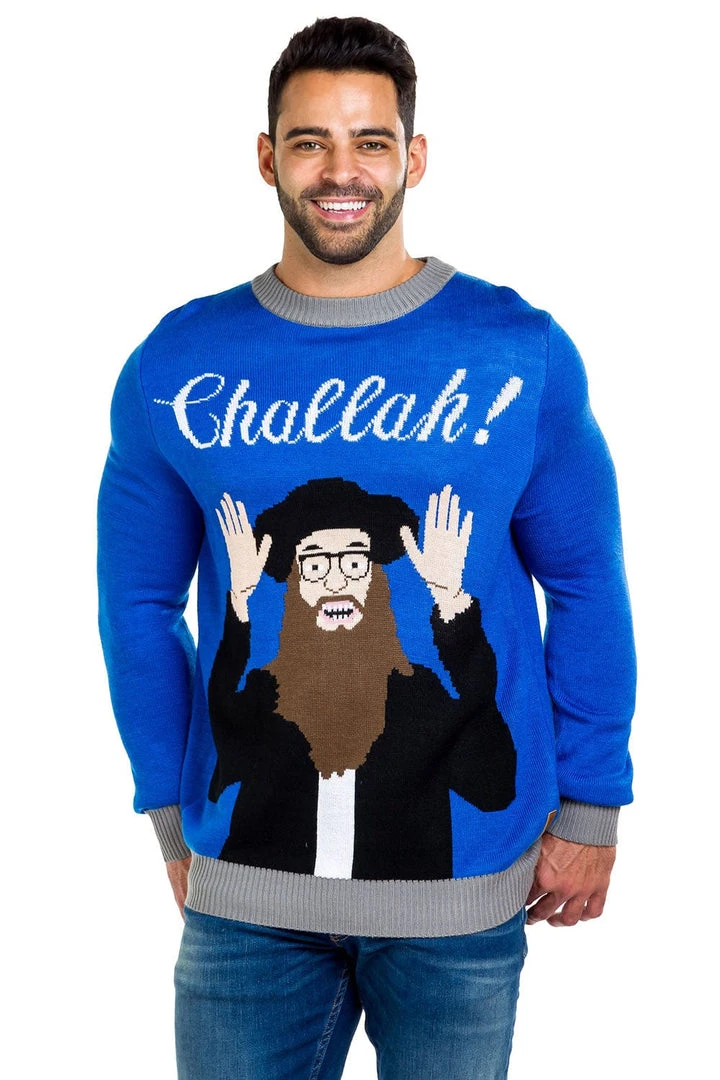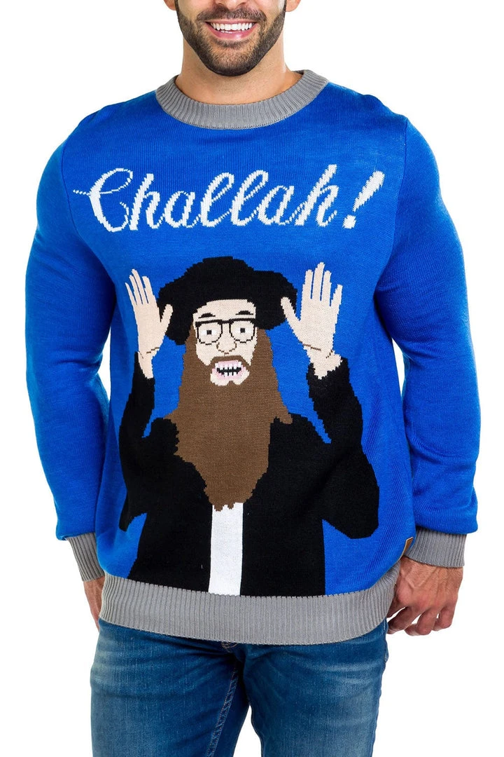 This Hanukkah sweater is as twisted as a Challah loaf but not as tasteful. The venerable Rabbi on this top is definitely excited about something. We can only guess that it’s the traditional sweet braided bread topped with poppy seeds or anise. Of course, there are two loaves on display as is right for the festivities on this religious holiday. And this gentleman is going to keep one loaf all for himself!