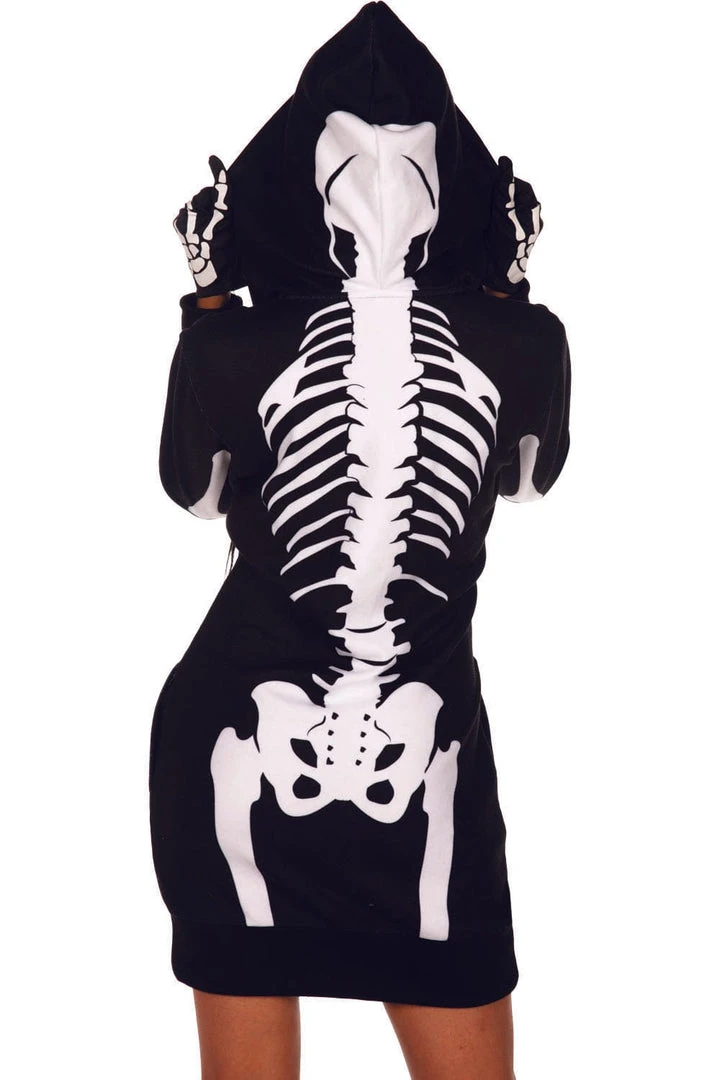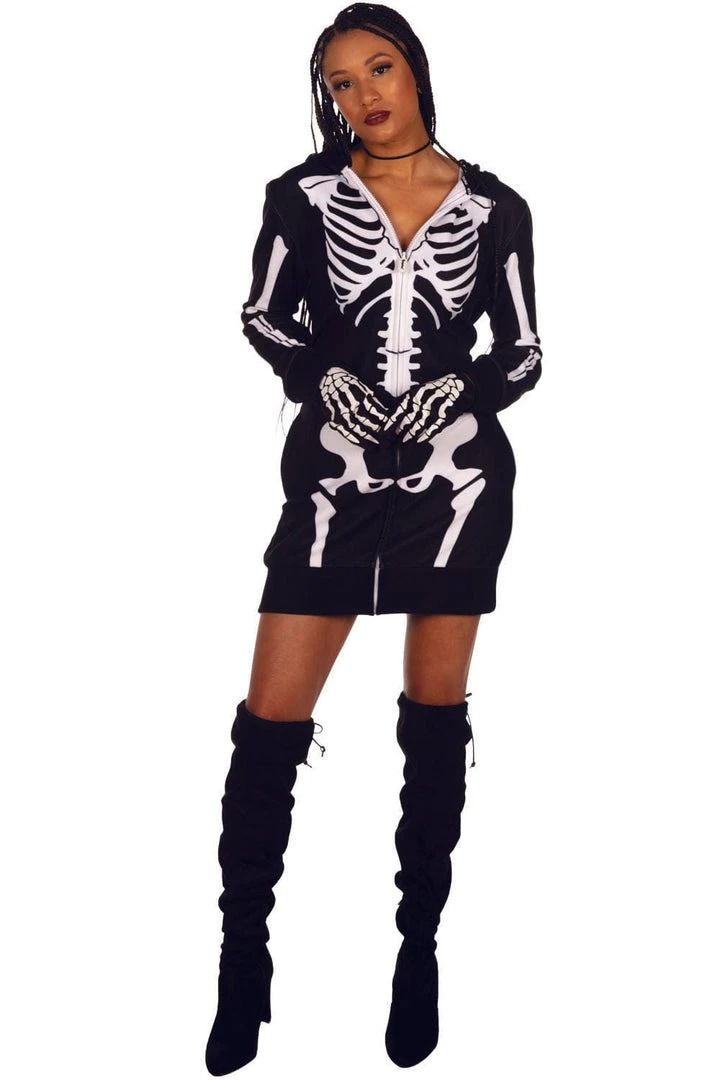 Feel like you’ve got no ‘body’ to go with this Halloween? OK, that was a crummy joke, but when better a time of year for terrible puns? Our Women’s Skeleton costume dress will inspire all kinds of dad jokes, plus it’ll make you look super hot. Wear it as a single one-piece if the weather is kind and you’re feeling risque. Or if you want to complete the look, why not head over to our accessories section and bag yourself a pair of skeleton knee high socks? You’ll have yourself a total biology lesson with this 100% accurate (unless a judge asks) depiction of the skeleton, complete with ribs, spine and those snake hips, baby. Plus, if you need to cuddle up and get away from the land of the living the next day – the hood is perfect for those Halloween hangovers. You don’t always need to move your bones.